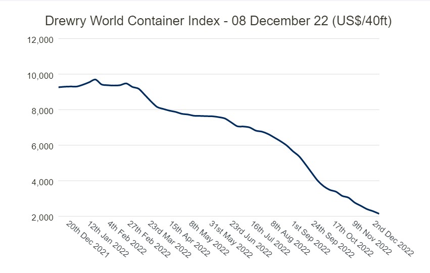 According to the latest World Container Freight Index WCI report released by Drury Drewry, a well-known shipping consultancy, on December 8, the WCI index continued to fall 6% this week to US $2138.70/FEU.